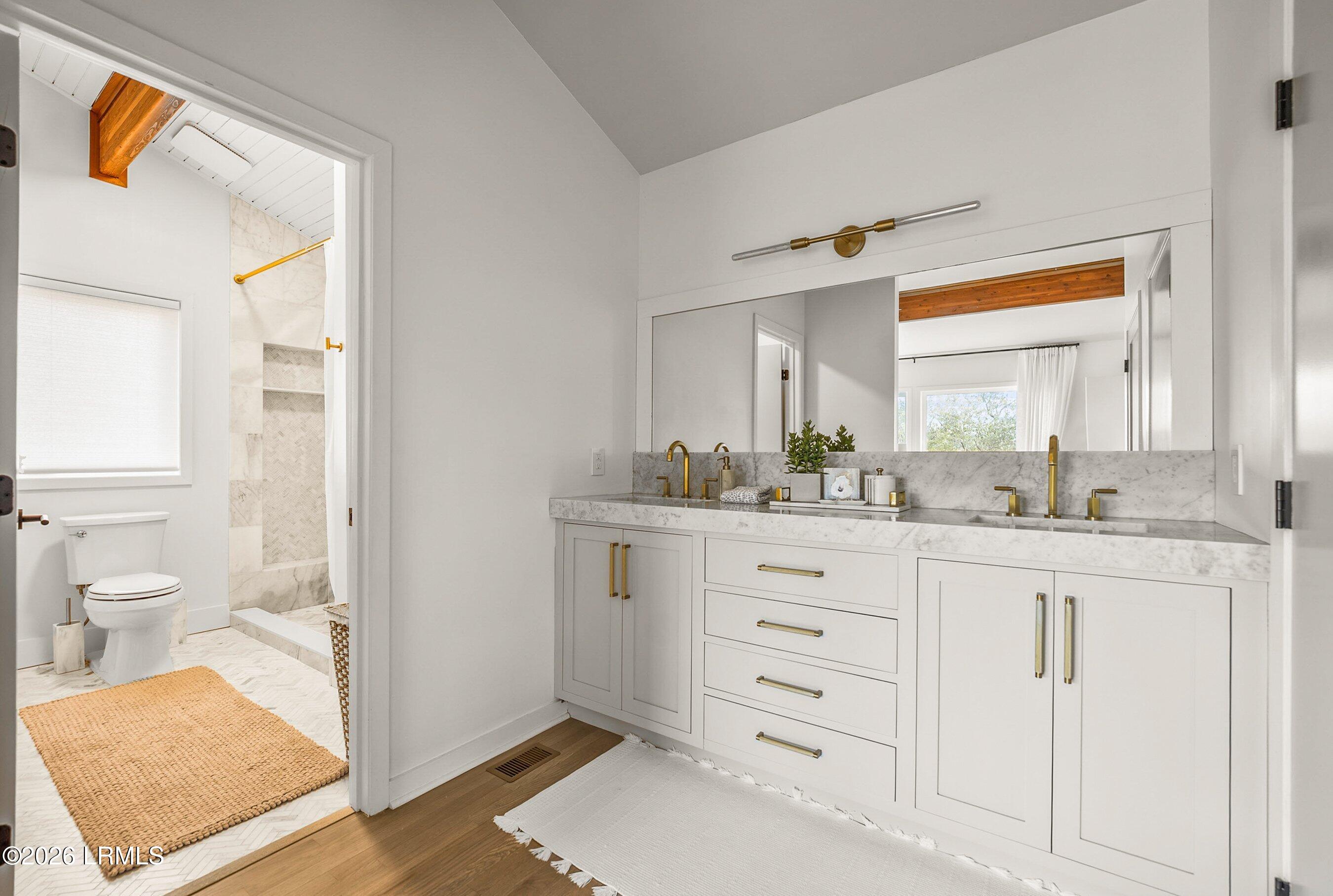 The main level features three bedrooms and three full baths, including the primary suite and a guest bedroom with an ensuite bath. Living, dining, and kitchen spaces flow together comfortably, creating a layout that works well for both everyday living and entertaining.